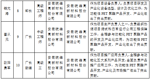 1、項目第完成人吳福勝與第二完成人許宏平、第三完成人高申保、第四完成人孫先武、第五完成人高峰、第七完成人柳巨瀾、第八完成人錢光海、第十完成人歐陽勇軍共同實施“多元改性功能化聚對苯二甲酸乙二醇酯研發(fā)及產(chǎn)業(yè)化”項目實施,合作方式為共同立項。