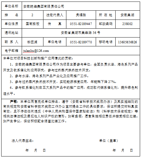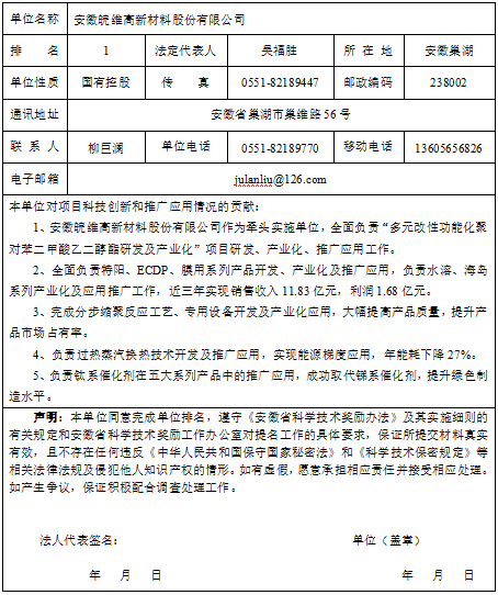 二、提名者:合肥市科技局; 提名意見:同意提名。