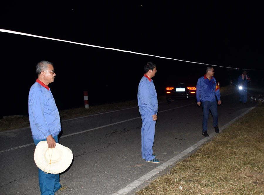 突擊隊(duì)員穿著膠鞋,遍遍地巡檢,不敢有絲毫懈怠。在大堤的后方,村莊里面還有幾戶人家亮著燈光。夜晚,那幾盞燈光讓人感到靜謐和安寧。這安寧為巡堤人帶來了力量,因?yàn)樗麄兪匦l(wèi)的正是安寧,通過自己的努力讓身后的村民以及無數(shù)市民能夠安然入眠。