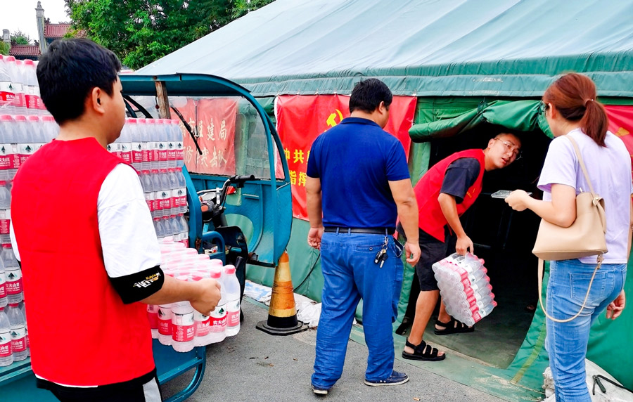 在得知這消息后,公司團(tuán)委迅速行動(dòng),利用之前募集的愛心善款購買了100箱礦泉水,并組織志愿者送到防汛人員手中。